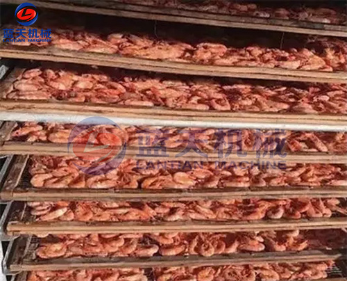 1、蒸煮后的蝦可帶殼烘干,也可剝殼對蝦仁進(jìn)行烘干。將煮好的海蝦瀝干水分后,均勻地?cái)傇诤姹P上,裝進(jìn)物料車,然后送入海蝦烘干房。