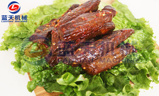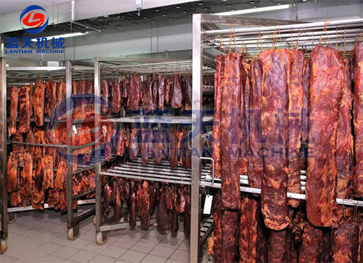 這一階段主要的制約因素是溫度的控制,為了加強(qiáng)干燥速度,溫度要升高到60到65度之間,烘干時(shí)間控制在10到12個(gè)小時(shí),相對濕度控制在35%左右。牛肉烘干最終濕度控制在15%以下。