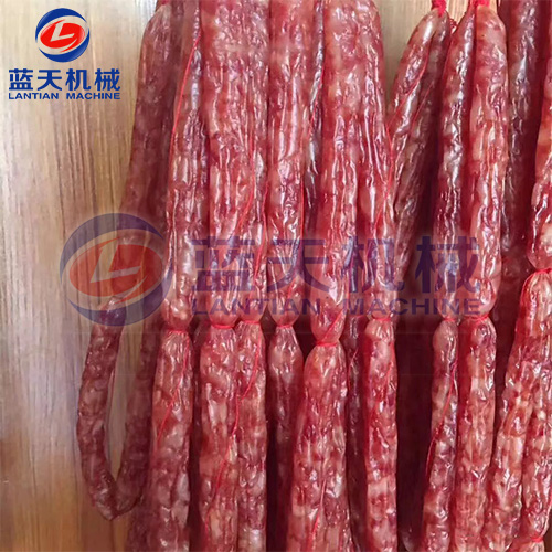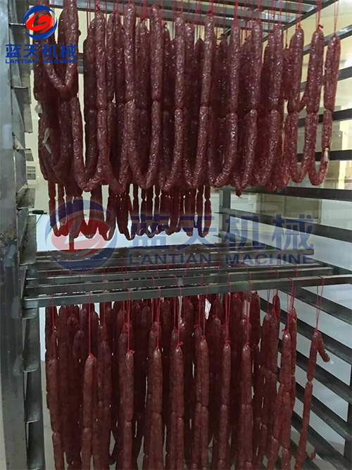 2、減速干燥階段。發(fā)色期和收縮定型期的控制,溫度控制在52℃~54℃,濕度控制在45%左右、時(shí)間為3到4個(gè)小時(shí),臘腸逐漸從淺紅色轉(zhuǎn)為鮮紅色,腸衣開(kāi)始收縮,這時(shí)一定要注意硬殼的出現(xiàn),可以進(jìn)行冷熱交替使用,效果更好。