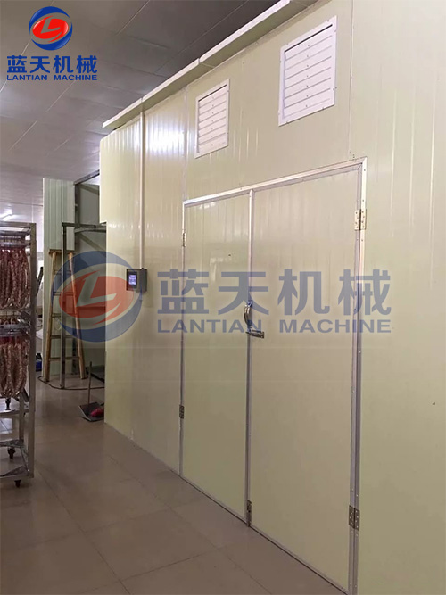 烘房設(shè)有燃煤管式熱風(fēng)爐,以對(duì)流換熱方式使臘味脫水干燥。用此種方法干燥臘味,缺點(diǎn)明顯:產(chǎn)品受煤灰、煙灰污染,干燥周期長(zhǎng)(一般要72小時(shí)左右),能耗大,臘肉需經(jīng)過(guò)多次“轉(zhuǎn)竹”和“升柜”,勞動(dòng)強(qiáng)度大,干燥過(guò)程的溫、濕度難以控制,臘味質(zhì)量不穩(wěn)定等。