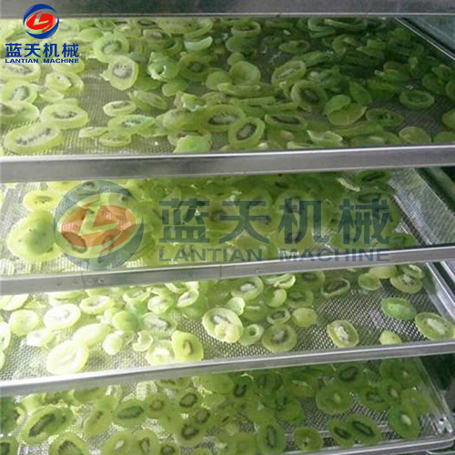 將糖煮好的獼猴桃果實(shí)撈出,瀝干糖液,放在竹篩網(wǎng)(或不銹鋼網(wǎng))上,送入烘房?jī)?nèi)烘干。烘干時(shí)應(yīng)將前期溫度控制在50℃,待果實(shí)半干時(shí),再將溫度提高到55~58℃,繼續(xù)干燥20小時(shí)左右即可。干燥好的果脯要求外部不粘手,捏起來(lái)有彈性。