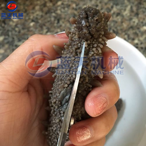 第一步:海參剪口擠腸:海參用清水清洗一下,從其腹部用剪子剪開兩三厘米的口,將內臟及腸子取出,不去掉腸子,整個海參都會化掉。