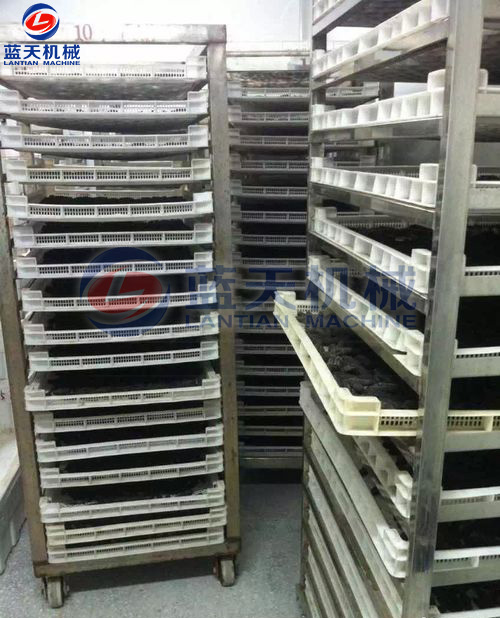 第四步:海參烘干:將煮好的海參擺放在物料盤上,將擺好海參的物料盤放置入空氣能熱泵海參烘干機內,通過智能控制系統(tǒng)設置烘干溫度、濕度和時間參數(shù),開始干燥。
