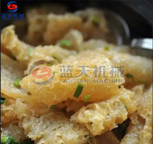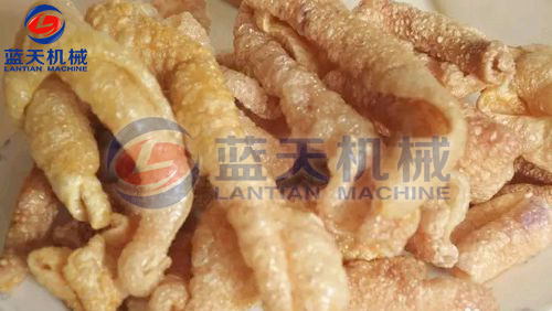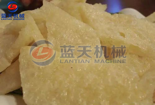 在油爆漲發(fā)前,豬皮需要在溫油中回軟,這是能否漲發(fā)的關(guān)鍵,油溫應(yīng)該掌握在40-50度左右,溫度高了也會(huì)影響漲發(fā)的程度,是否回軟達(dá)標(biāo)、視肉皮軟塌程度確定,這項(xiàng)操作標(biāo)準(zhǔn)在文字上無(wú)法準(zhǔn)確清楚表述,只有在加工過(guò)程中熟能生巧,最終生產(chǎn)加工經(jīng)驗(yàn)是主要的?;剀浐蟮拇捅馄?yīng)該保持回軟狀態(tài)不能回硬,將鍋中油溫升到80度后即可將肉皮放入油鍋中,邊翻動(dòng)邊加溫,油溫達(dá)到120度時(shí)豬皮就可以漲發(fā)好了,在漲發(fā)時(shí)油溫應(yīng)掌握好,不得過(guò)高,關(guān)鍵是保持不焦不老不黃的感官程度和完全漲發(fā)開(kāi)的標(biāo)準(zhǔn),完全漲發(fā)后的皮肚,從熱油鍋內(nèi)撈出后應(yīng)當(dāng)控盡油脂并冷卻到常溫后方可包裝。不得未控盡油脂和降低溫度就進(jìn)行包裝,否則既影響包裝又影響產(chǎn)品質(zhì)量。