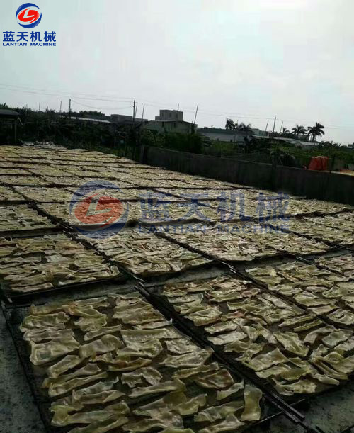 是利用太陽(yáng)曬干的,整個(gè)過(guò)程需要持續(xù)四五天的時(shí)間,還需要工人在現(xiàn)場(chǎng)看管,但也避免不了蟲(chóng)蟻灰塵的污染。如遇上陰雨天,豬皮曬干不及時(shí)就可能走味,給豬皮的干燥帶來(lái)諸多麻煩。