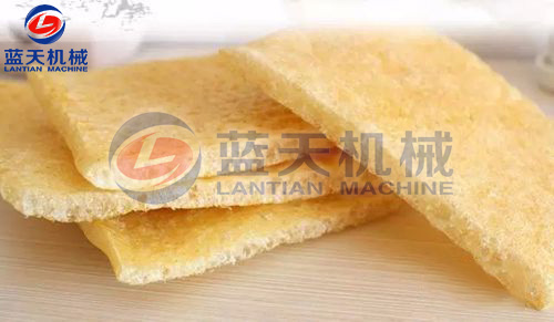 用錐形高壓半自動(dòng)膨化機(jī),加熱升溫,使機(jī)膛內(nèi)壁升溫均勻,將干燥處理好的豬皮塊1~1.5公斤裝入機(jī)膛內(nèi),加入適量膨化劑,扣緊封閉壓力開(kāi)關(guān),迅速加熱升溫,使機(jī)內(nèi)溫度達(dá)150~180℃,每分鐘轉(zhuǎn)速為80~100轉(zhuǎn),機(jī)內(nèi)產(chǎn)生一定的壓力,隨著溫度的升高,經(jīng)5~7分鐘,壓力達(dá)到10個(gè)表壓(壓力表指到10)時(shí),停止加熱,打開(kāi)壓力開(kāi)關(guān),即可噴爆,將膨化好的豬皮裝入塑料袋中,封口即為成品。