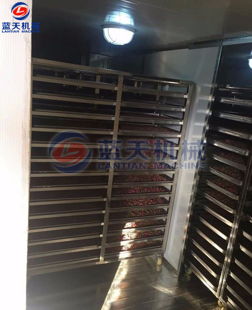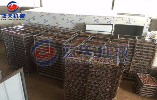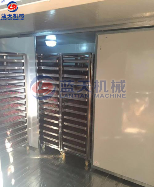 裝滿花蕾的物料車要輕輕推入烘干房,關(guān)閉烘干房室門升溫,嚴(yán)格控制室內(nèi)溫度、依次順序溫度慢慢提升,采用循環(huán)風(fēng)路,確?;ɡ俑蓾窬鶆?,色澤鮮艷。