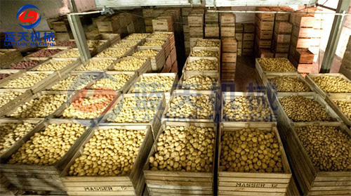 (6) 烘干:將處理好的馬鈴薯丁或薄片攤放烘盤(pán)上,厚度10~20mm,置于騏成全智能化烘干房中,溫度為65~70℃。干燥后期溫度勿超過(guò)65℃,完成干燥需要5~8小時(shí)。含水量降低到7%以下,即已完成干燥過(guò)程。