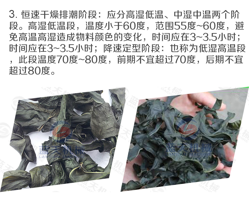 1、溫度—海帶的烘干一般要求比較低的溫度下進(jìn)行,以避免高溫影響產(chǎn)品烘干后的質(zhì)量。