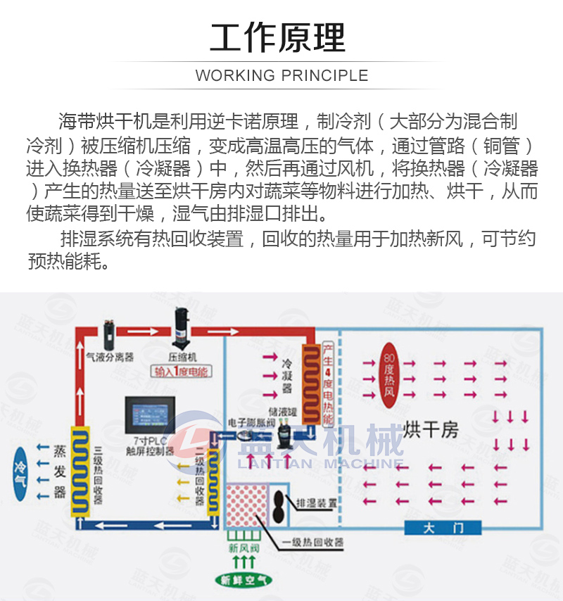 2、濕度—海帶的一般含水量比較大。因此控制好海帶烘干房排濕量是決定烘干質(zhì)量的重要因素。另外,由于海帶的水分多,脫水較困難,控制脫水速度很關(guān)鍵。