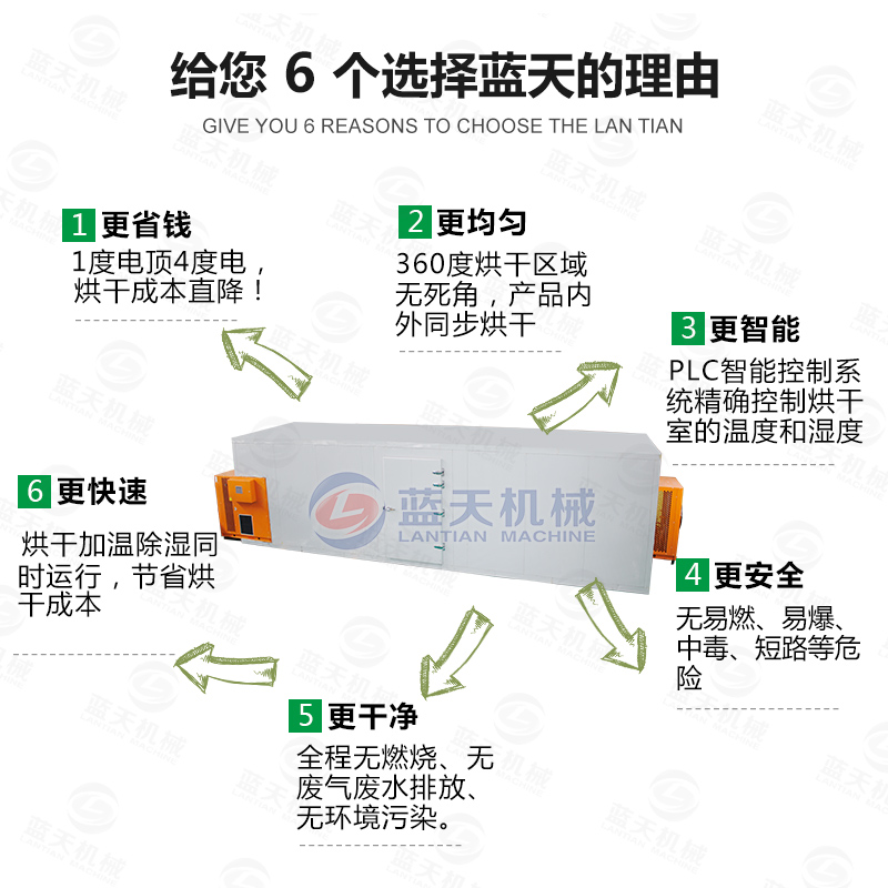 要達(dá)到以上的要求,那么烘干設(shè)備是很?chē)?yán)格的。傳統(tǒng)的太陽(yáng)晾曬等方法都是不合格的,海帶烘干機(jī)需要消耗少量的電就能從空氣能吸取大量的熱能使烘干房迅速升溫,同比傳統(tǒng)的烘干設(shè)備節(jié)能百分之六十以上。海帶烘干設(shè)備在常壓常溫下運(yùn)行,烘干過(guò)程幾乎沒(méi)有污染物排放,不會(huì)對(duì)產(chǎn)品和環(huán)境造成污染。海帶烘干房是真正可靠的新型烘干設(shè)備。海帶烘干機(jī)烘干成本低,效率也高,提高了商家的利益,我們都知道海帶的價(jià)格是很便宜的,所以如果想要從中獲得利益,那么成本不能高,成本一高,也就掙不到什么。所以海帶烘干機(jī)是適合用來(lái)烘干海帶的。
