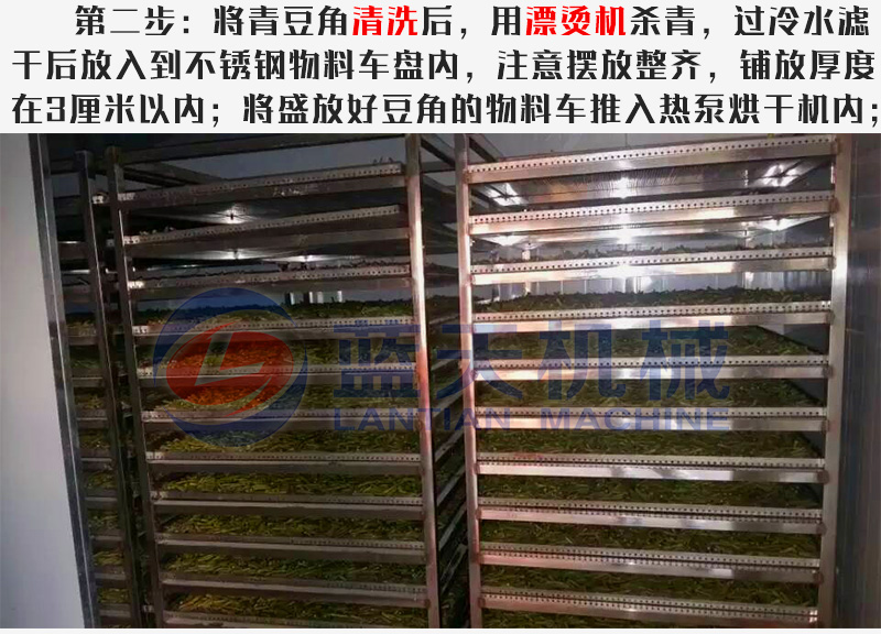 二:將青豆角清洗后,用沸水煮熟,濾干水后放入到不銹鋼物料車盤內,注意擺放整齊,鋪放厚度在3厘米以內。