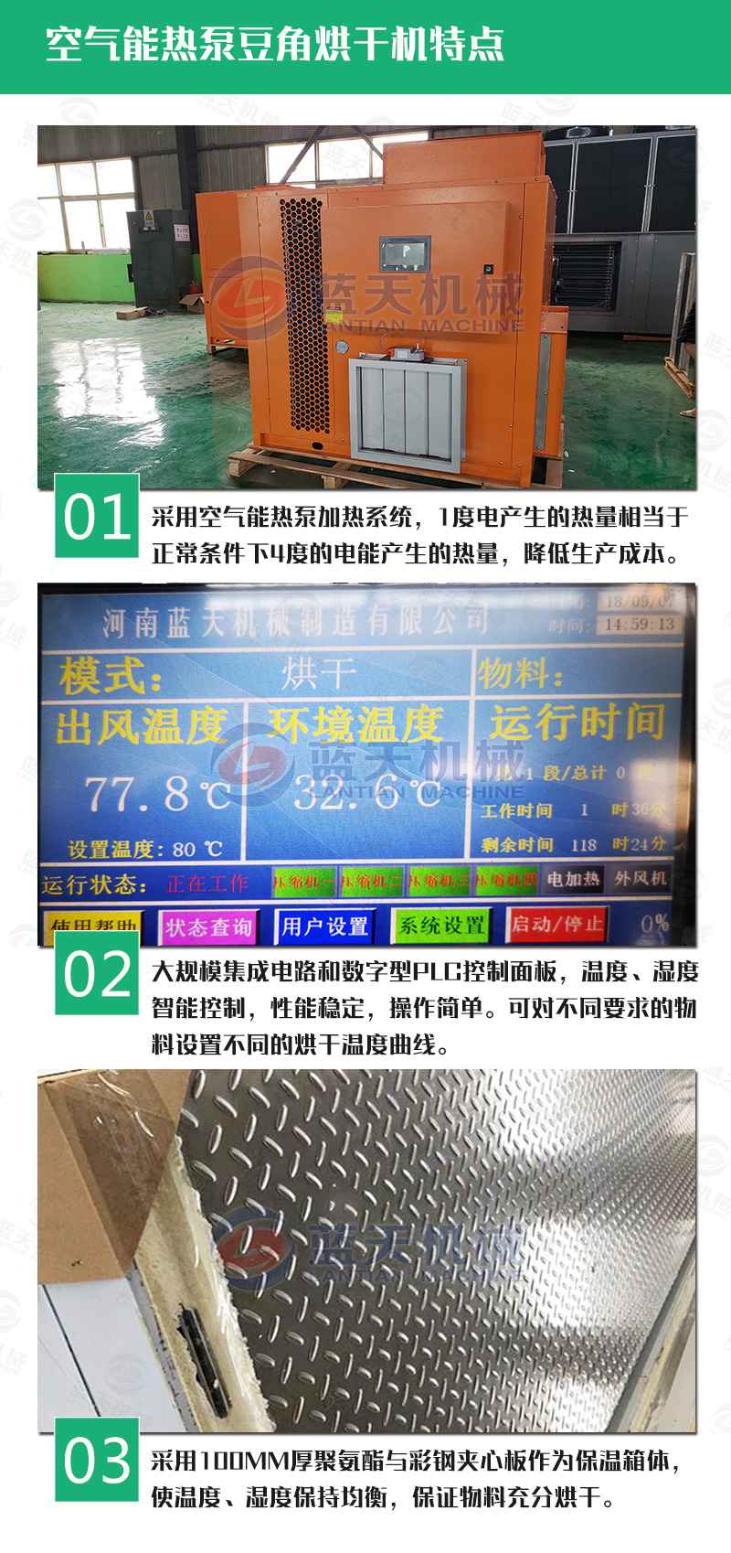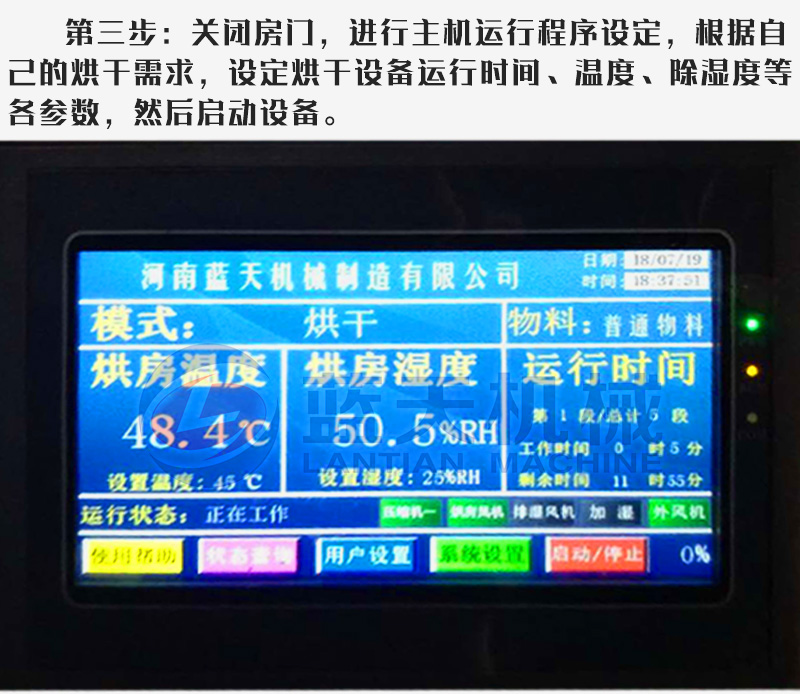 三:將盛放好豆角的物料車推入豆角烘干機設備內,關閉房門,進行主機運行程序設定,根據自己的烘干需求,設定烘干設備運行時間、溫度、除濕度等各參數,然后啟動設備。