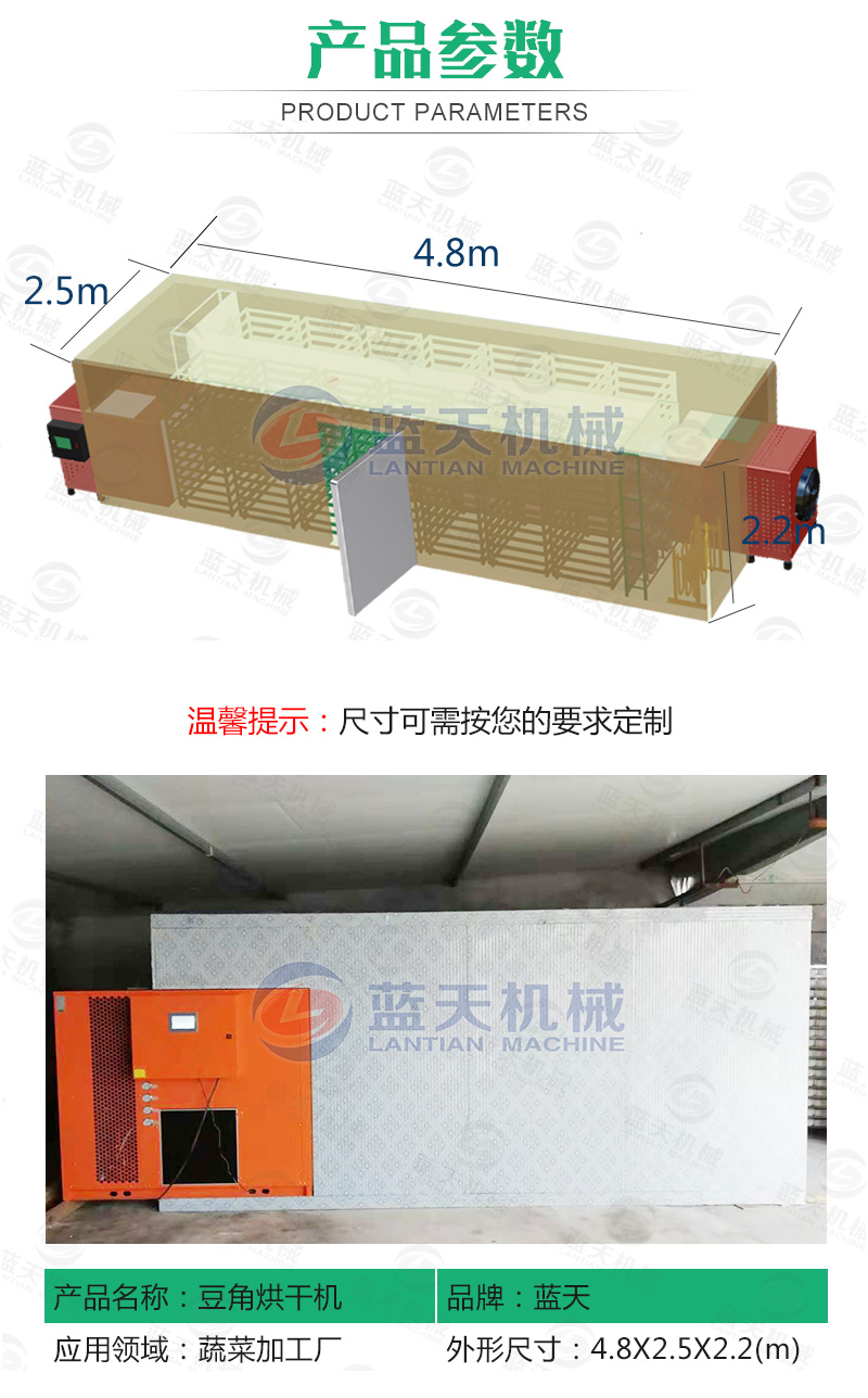 四:運行時間到達后,主機自動停機,待豆角在豆角烘干機內再燜1個小時后,推出物料車,整個豆角烘干完成。