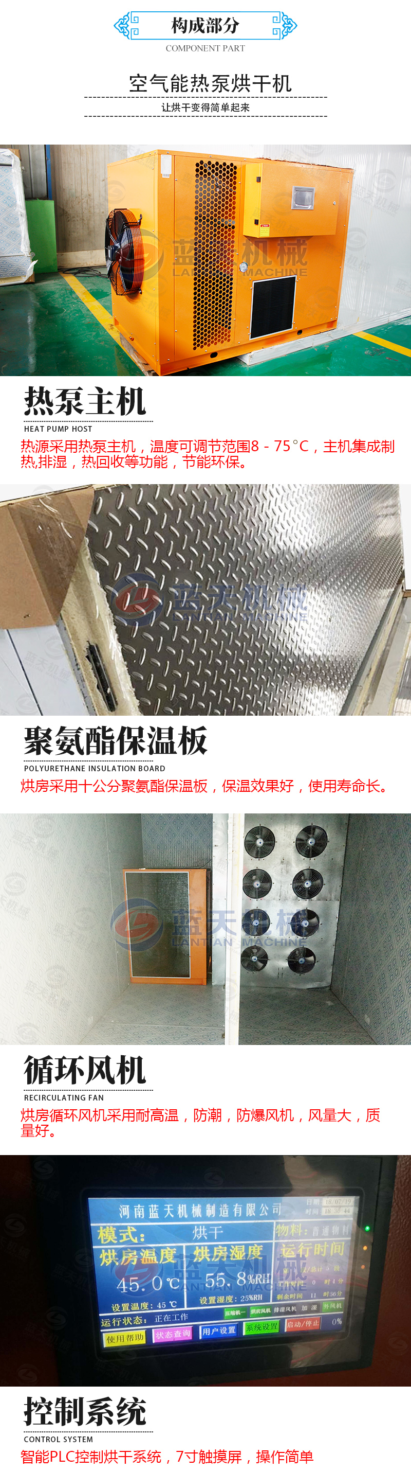 空氣能熱泵烘干設備有哪些功能?標配的功能有烘干、除濕、排濕、冷干、四效熱回收、觸摸屏控制、可編程(分10個時段)